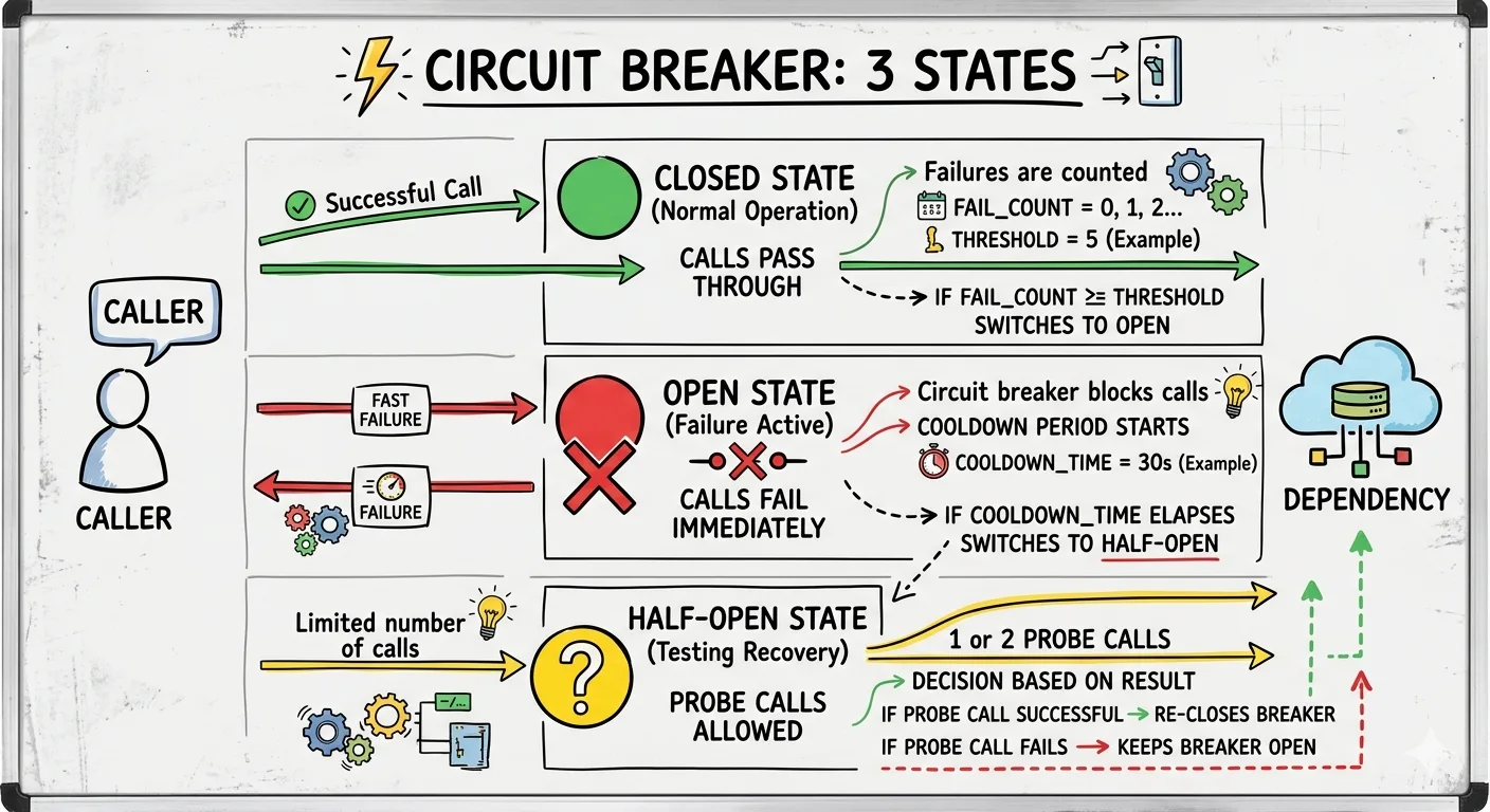 A circuit breaker sits between a caller and a dependency and tracks failure. It has three states. Closed: calls pass through and failures are counted. Open: calls fail immediately without hitting the dependency. Half-open: after a cooldown, one or two probe calls decide whether to close the breaker again or keep it open.