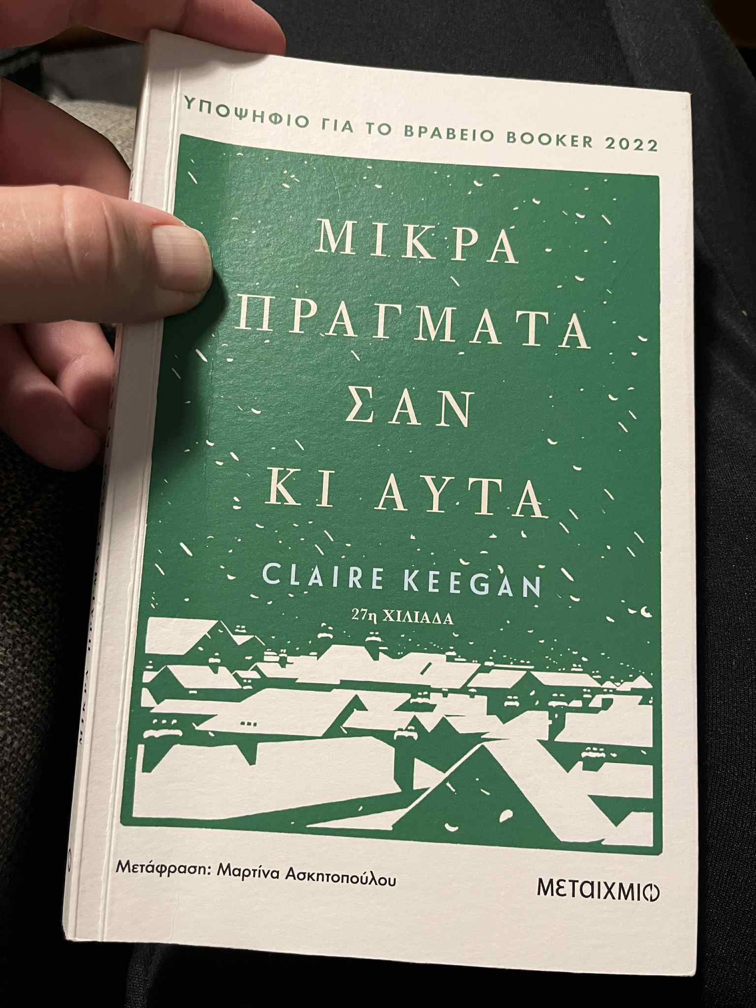 Last Monday we were flying out of Athens' Eleftherios Venizelos Airport to Berlin after a short holiday. The flight is about three hours, and I wanted to pick up a book I could finish during the trip. My eye landed on "Small Things Like These" by Claire Keegan. I mostly read non-fiction, so I hadn't heard of it before, but something about the title, the cover, and the fact that it was only 125 pages (something I could actually finish on the flight) convinced me to buy it.