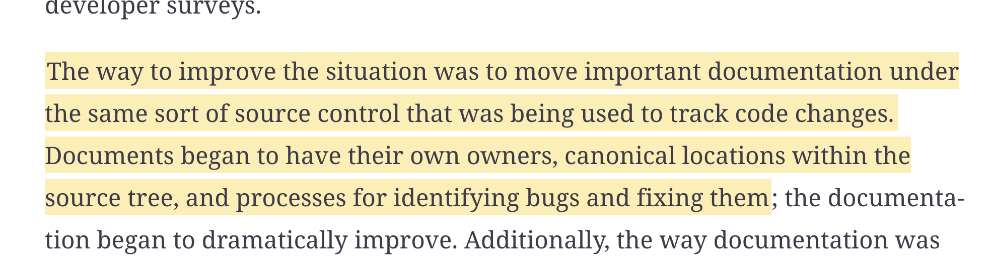 Google follows the same philosophy for years treating documentation as code. In the book Software Engineering at Google there is a whole section on documentation, there they mention: