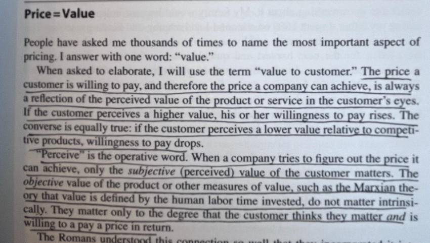 The most naive way to define a price is to calculate our costs and add a margin. Simon calls this out as a fallacy, referencing Marxian theory: